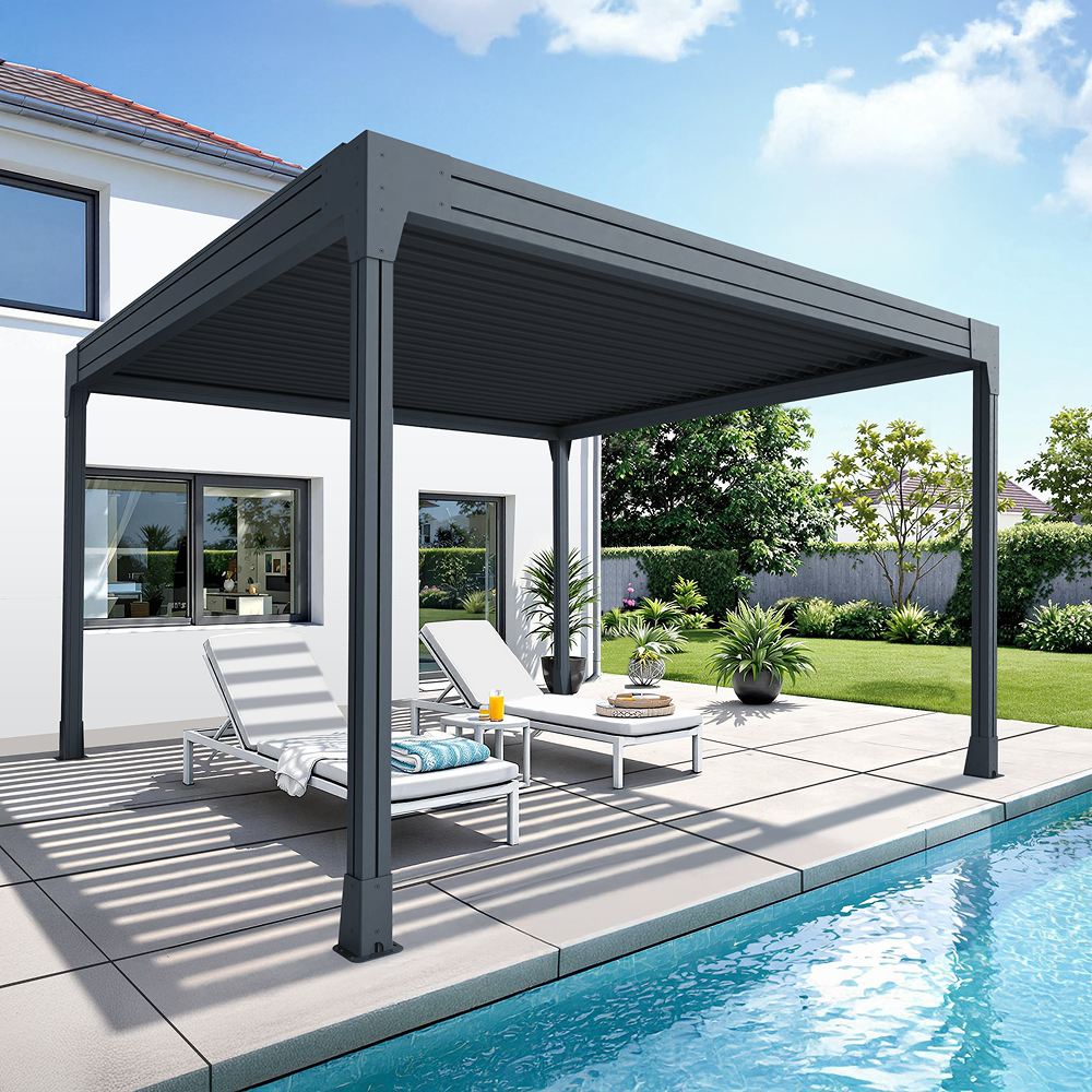 La pergola Mambo 3 autoportée permet de s'offrir une pergola sur 4 pieds qui sera majestueuse dans votre jardin. Vous ne pouvez ou ne souhaitez pas percer les murs de votre façade ? Le modèle îlot est fait pour ces situations. Avec une légère ventilation née de l'orientation des lames, la pergola bioclimatique autoportée est le must-have des jardins en 2025.