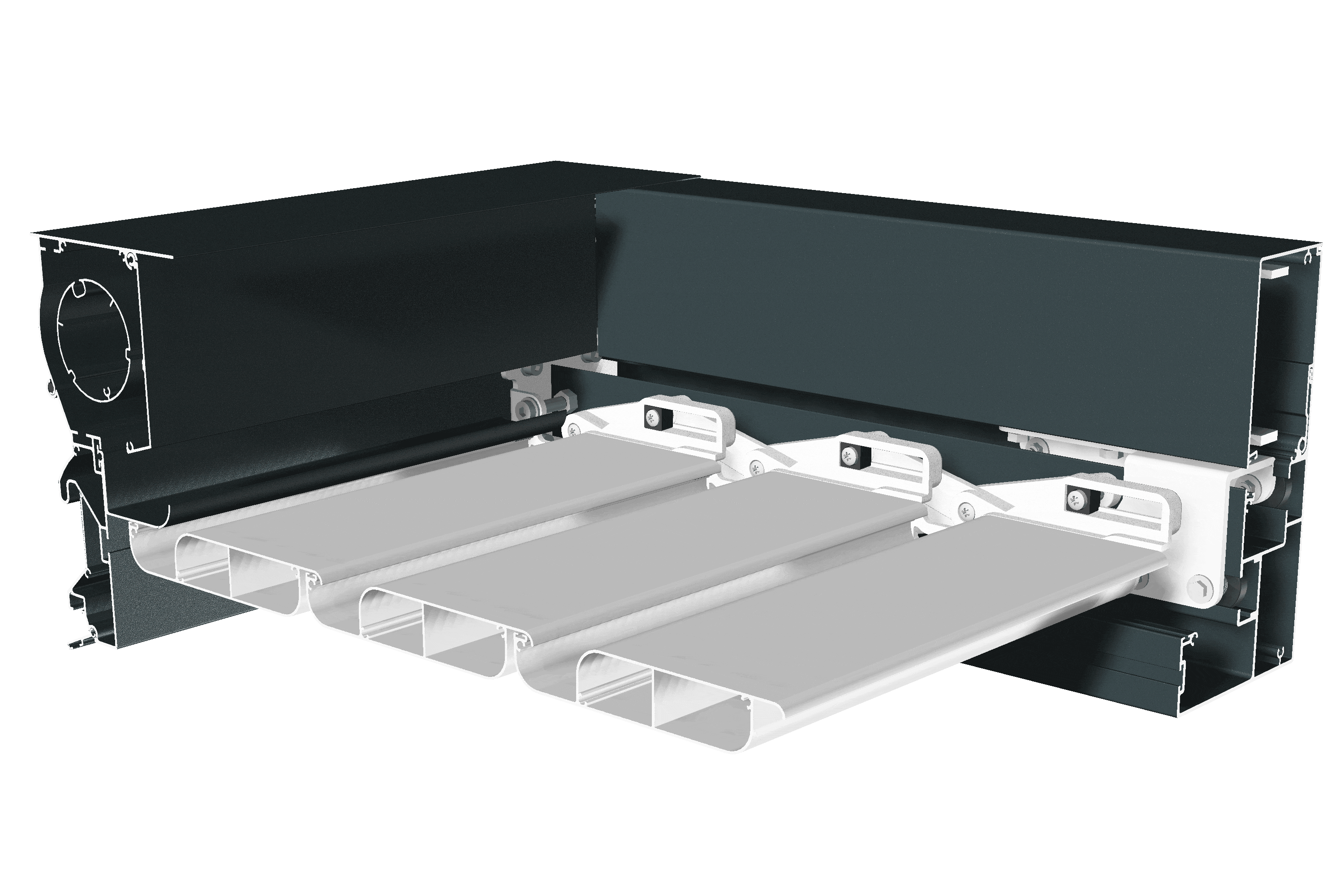 Grâce à des glissières intégrées dans chaque bouchon de lame, l’orientation commence dès le début de l’ouverture, jusqu’à 45° sur le premier quart de l’avancée. Par exemple, pour une pergola de 4 mètres, les lames peuvent couvrir 75% de la surface tout en laissant passer 50% de la lumière, selon l'angle choisi. Et une fois totalement ouvertes, elles se replient de manière compacte, occupant seulement un quart de l’espace disponible, pour un ensoleillement maximal.