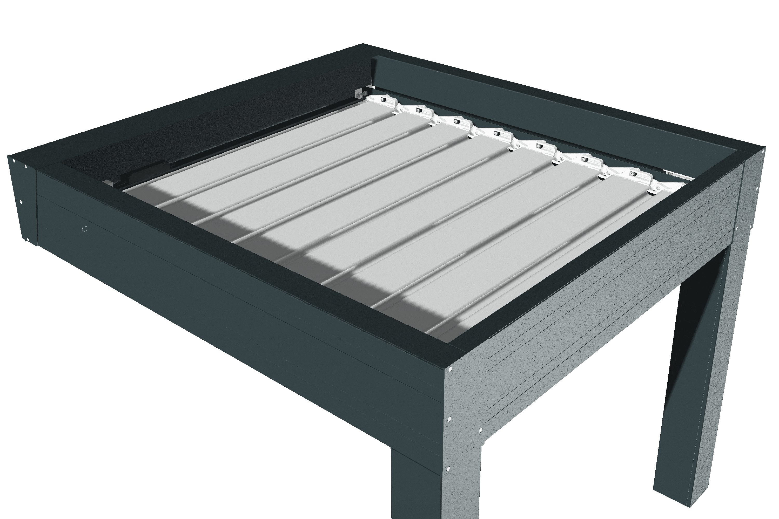 La pergola Mambo 5 est motorisée avec un moteur tubulaire TELCO®, couplé à deux larges courroies crantées renforcées de 20 mm, qui entraînent la première lame et assurent l’ouverture fluide de l’ensemble du tablier. Ce mécanisme robuste est discrètement intégré dans les chevrons latéraux, protégé par un capot étanche pour une durabilité optimale et un design épuré.