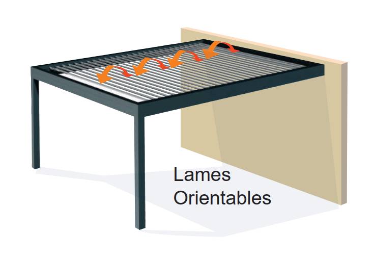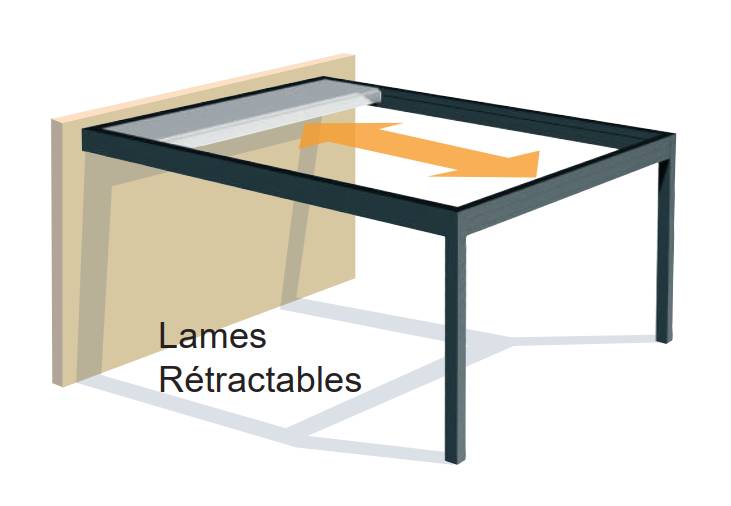 - Pergola à lames rétractables et orientables en même temps grâce à un système breveté